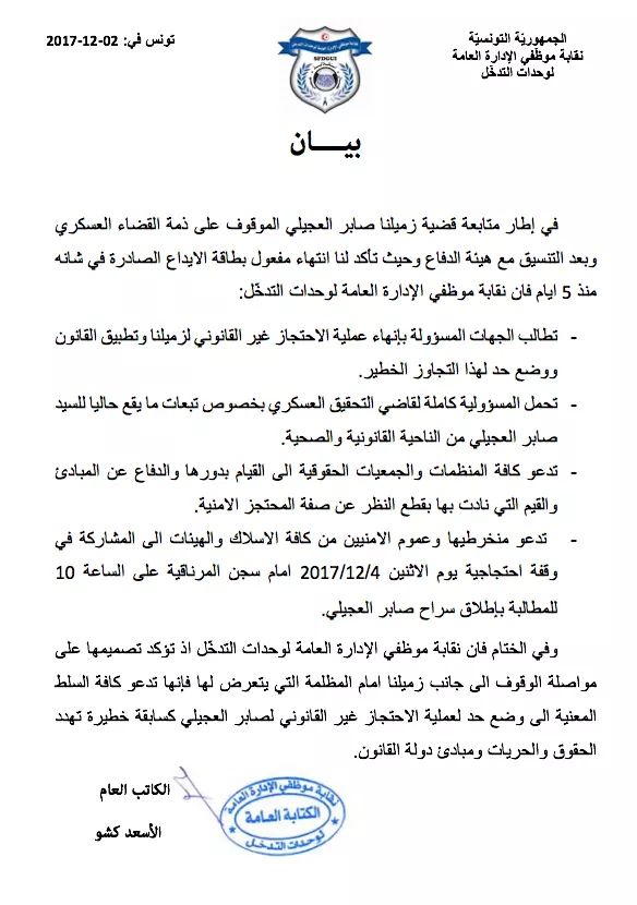 طالبت نقابة موظفي الإدارة العامة لوحدات التدخل في بيان السبت الجهات المسؤولة بإنهاء ما وصفته 'احتجازا للأمني الموقوف صابر العجيلي'، داعية منخرطيها وكافة الأمنيين إلى المشاركة في وقفة احتجاجية يوم الاثنين المقبل أمام مقر وزارة العدل بالعاصمة للمطالبة بإطلاق سراحه.