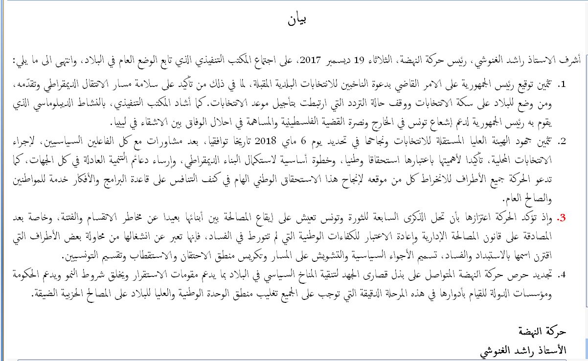 عبرت حركة النهضة في بلاغ عن انشغالها من محاولة 'بعض الأطراف التي اقترن اسمها بالاستبداد والفساد، تسميم الأجواء السياسية والتشويش على المسار وتكريس منطق الاحتقان والاستقطاب وتقسيم التونسيين، حسب نص البلاغ.