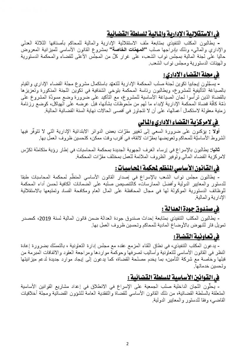 وطالب المجلس بتجاوز الإخلالات التي شابت الحركة القضائية السابقة، داعيا إلى ضرورة التعجيل بوضع سلم تقييمي للقضاة ونشره، يعتمد معايير موضوعية في التسميات في الخطط القضائية والترقيات والنقل، يستند إلى مبادئ الكفاءة والنّزاهة والحياد، وفقا للدستور والمعايير الدولية.