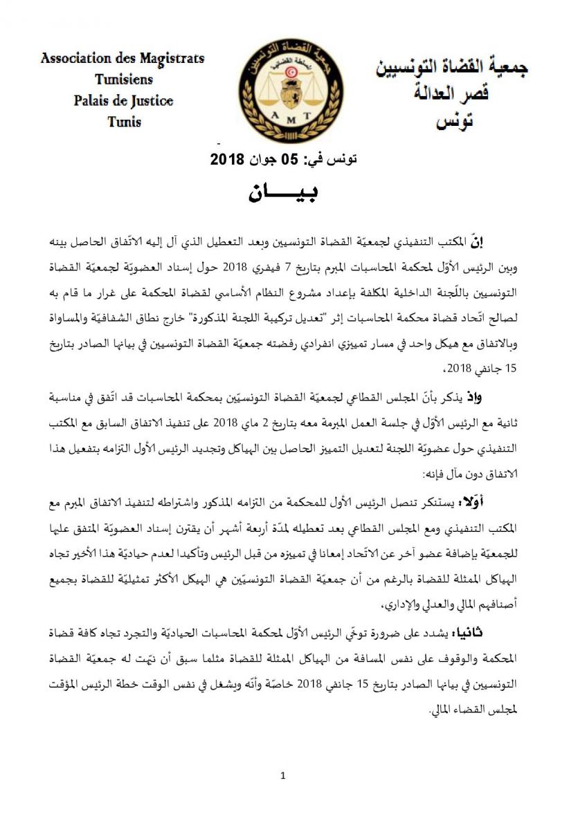 حذر المكتب التنفيذي لجعية القضاة التونسيين في بلاغ الثلاثاء 5 جوان 2018 من التداعيات الخطيرة للسياسة المتبعة من الرئيس الأول في إدارة محكمة المحاسبات على سير العمل بها وعلى العلاقات بين القضاة المنتسبين إليها، مؤكدا تمسكه بالدفاع عن حقوق منخرطي الجمعية في عضوية اللجان الداخلية والبعثات الخارجية وفي معاملتهم على قدم المساواة مع غيرهم.