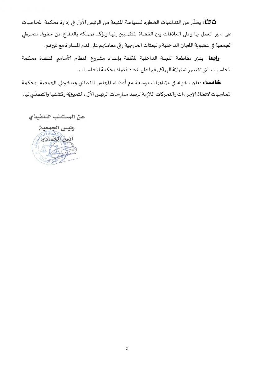 كما أعلن دخوله في مشاورات موسعة مع أعضاء المجلس القطاعي ومنخرطي الجمعية بمحكمة المحاسبات لاتخاذ الاجراءات والتحركات اللازمة لرصد الممارسات التمييزية للرئيس الأول وكشفها والتصدي لها.