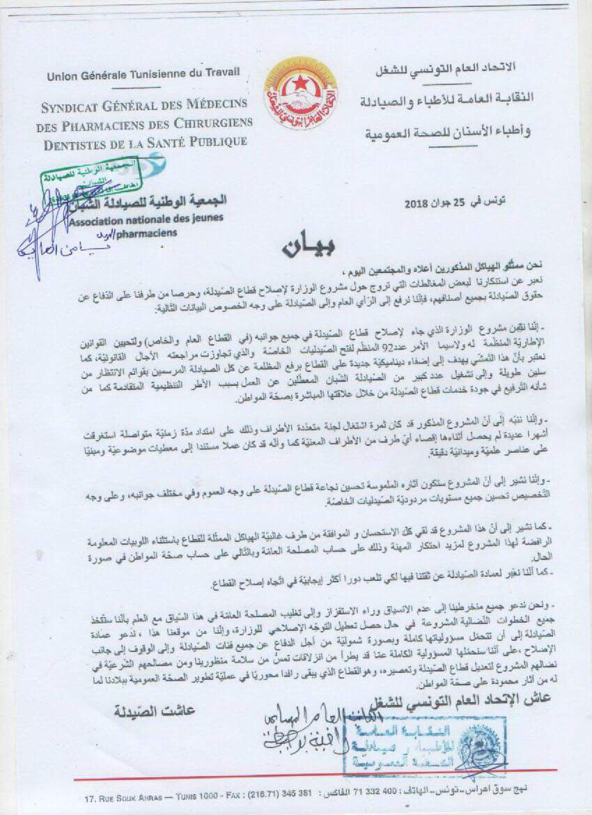 ودعت عمادة الصيادلة الى تحمل مسؤوليتها كاملة وبصورة شمولية من أجل الدفاع عن الصيادلة وإلى الوقوف إلى جانب الإصلاح، قائلة إنها ستحملها المسؤولية الكاملة عما قد يطرأ من اتنزلاقات تمس من سلامة منظوريها ومن مصالحهم في نضالهم.
