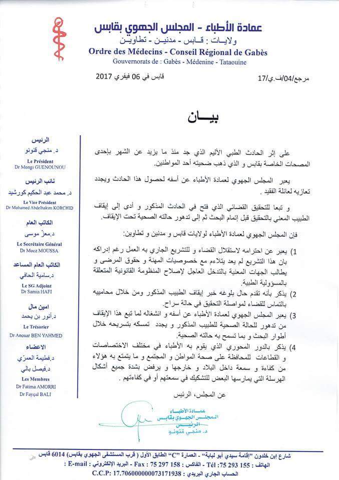 وتبعا للتحقيق القضائي الذي فتح في الغرض وأدى إلى إيقاف الطبيب المعني بالتحقيق، عبر المجلس الجهوي لعمادة الأطباء لولايات قابس ومدنين وتطاوين عن احترامه لاستقلال القضاء وللتشريع الجاري به العمل.