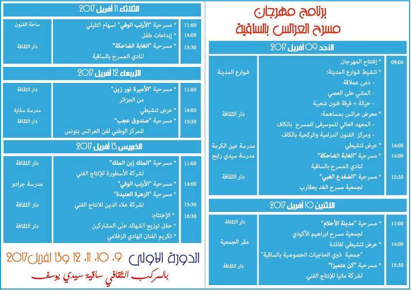 تنظم دار الثقافة ساقية سيدي يوسف "مهرجان مسرح العرائس" في دورته الأولى بساقية سيدي يوسف وبين فضاءاتها وشوارعها وساحة الفنون والمدارس الابتدائية بها، مسرح العرائس وعروضه التونسية المتميزة مع عرض جزائري كضيف شرف لهذه الدورة الأولى.