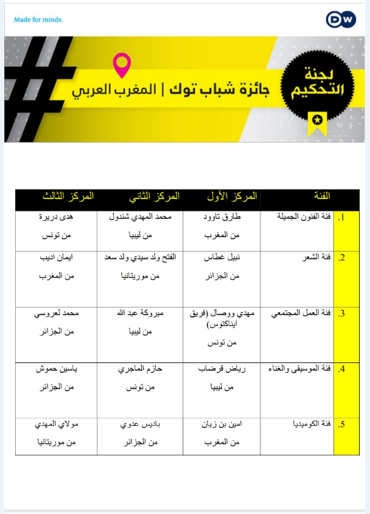 وضمّت لجنة التحكيم الفنانة سعاد ماسي من الجزائر، والفنان الكوميدي طاليس من المغرب والناشطة ألفة التراس من تونس إضافة إلى الشاعر التقي ولد الشيخ من موريتانيا والفنانة هادية قانة من ليبيا.