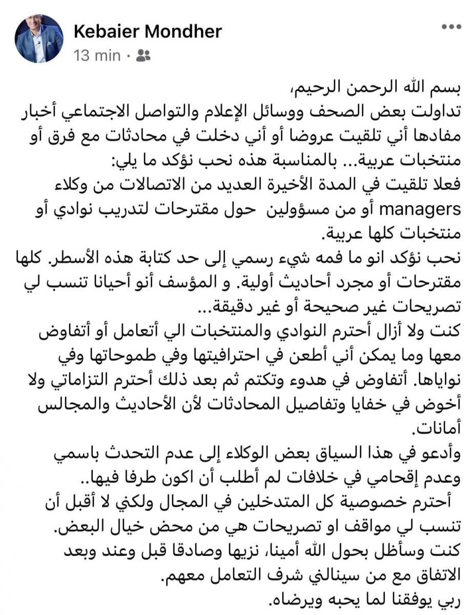 نشر مدرب المنتخب الوطني السابق المنذر الكبير تدوينة على حسابه على الفايسبوك قدّم من خلالها توضيحات حول بعض التصريحات التي تم تداولها ونسبها إليه، وسط تواتر أخبار مفادها امكانية توليه تدريب الرجاء البيضاوي المغربي خلفاً للبلجيكي المقال مارك فيلموتس.