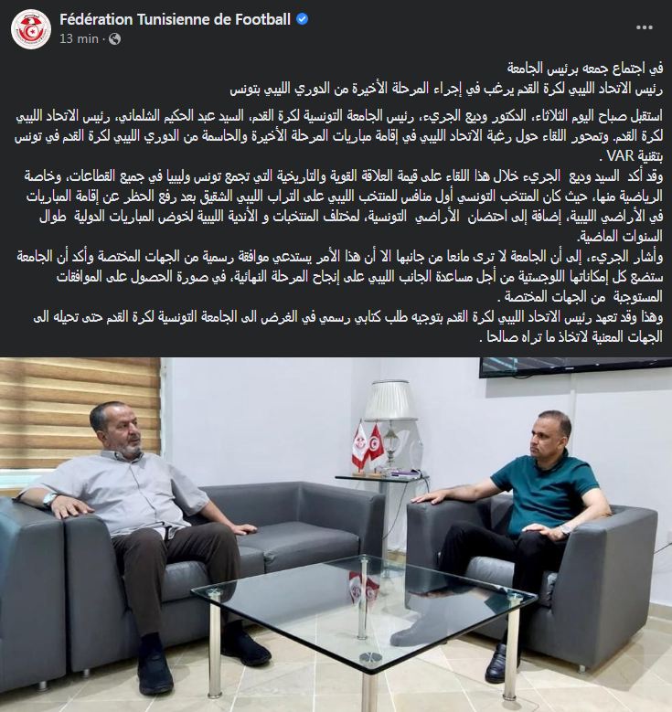 استقبل صباح اليوم الثلاثاء 21 جوان 2022، رئيس الجامعة التونسية لكرة القدم وديع الجريء، رئيس الاتحاد الليبي لكرة القدم عبد الحكيم الشلماني. وتمحور اللقاء حول رغبة الاتحاد الليبي في إقامة مباريات المرحلة الأخيرة والحاسمة من الدوري الليبي لكرة القدم في تونس بتقنية VAR.