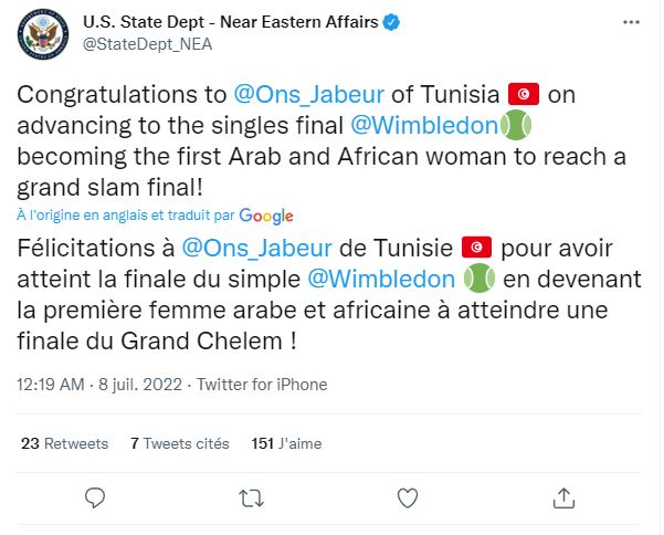 وقال حساب قسم الشرق الأدنى في وزارة الخارجية الأمريكية على تويتر: "مبروك لأنس جابر على التأهل، فقد أصبحت أول امرأة عربية وأفريقية تصل إلى نهائي غراند سلام".