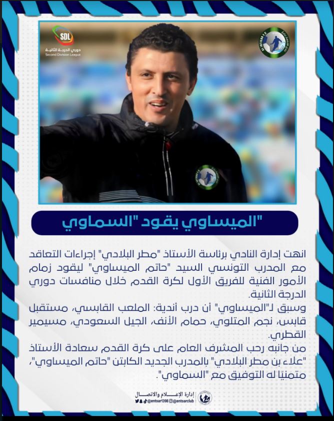 ويأتي البلاغ الذي نشره نادي الانتصار السعودي سويعات بعد إعلان الملعب التونسي تعيين الفني التونسي ذاته، حاتم الميساوي، مدربًا للفريق خلفًا لاسكندر القصري.
