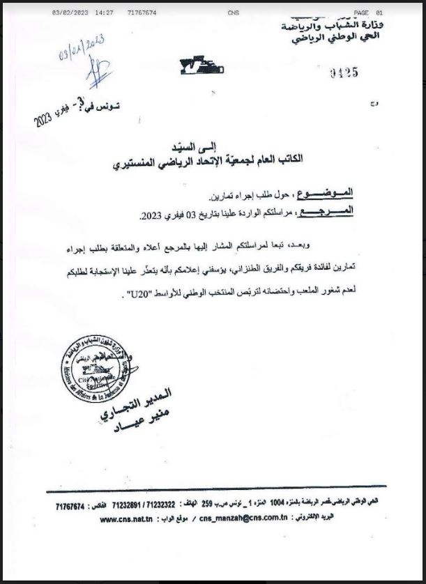 بعد أن تلقت إدارة الاتحاد الرياضي المنستيري اليوم مراسلة من إدارة الحي الوطني الرياضي بالمنزه التي اشترطت مبلغ 30.001000 لاستغلال ملعب رادس مع الدفع مسبقا، دون اعتبار شروط أخرى حسب نص المراسلة لخوض سباق دوري مجموعات كأس الاتحاد الافريقي المبرمج يوم الأحد 12 فيفري 2023 لحساب الجولة الافتتاحية من مرحلة الذهاب لدوري كأس الكنفدرالية الإفريقية، فقد تلقت الكتابة العامة عشية اليوم مراسلة ثانية يعلن فيها المدير التجاري منير عياد تعذر اجراء تمارين فريق الاتحاد المنستيري والفريق التنزاني برادس لعدم شغور الملعب بسبب احتضانه لتربص المنتخب الوطني للاواسط "u20" ليقع الفريق في ورطة ثانية بسبب هذا القرار المفاجئ .