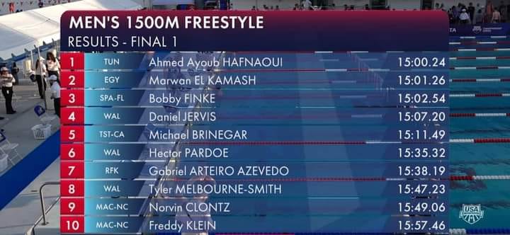 حقّق البطل الاولمبي التونسي أيوب الحفناوي رقما شخصيا جديدا في سباق 1500 متر بملتقى Pro Tyr de fort بالولايات المتحدة الامريكبة بتوقيت 15.00.24 متفوقا على البطل الاولمبي الامريكي بوبي فينك الذي حل ثالثا في السباق بتوقيت 15.02.54، وفق ما جاء في تدوينة للجنة الوطنية الأولمبية على صفحتها بفيسبوك.