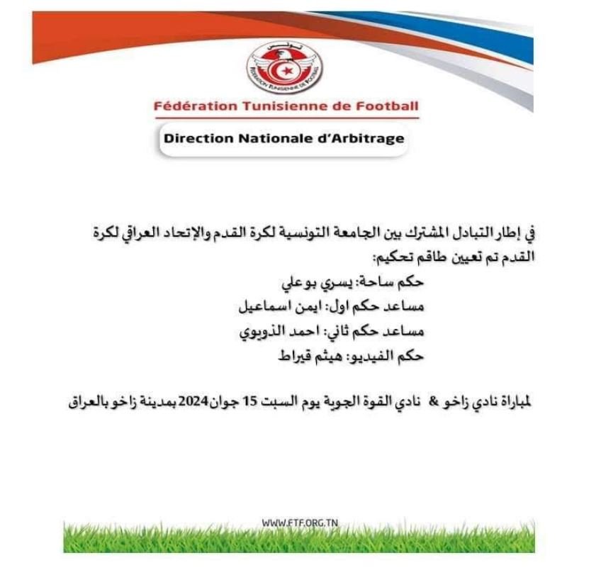 أعلنت الادارة الوطنية للتحكيم في بلاغ اليوم الأربعاء 12 جوان 2024 أن الحكم التونسي يسري بوعلي سيدير لقاء نادي زاخو ونادي القوة الجوية المقررة يوم السبت 15 جوان 2024 لحساب البطولة العراقية.