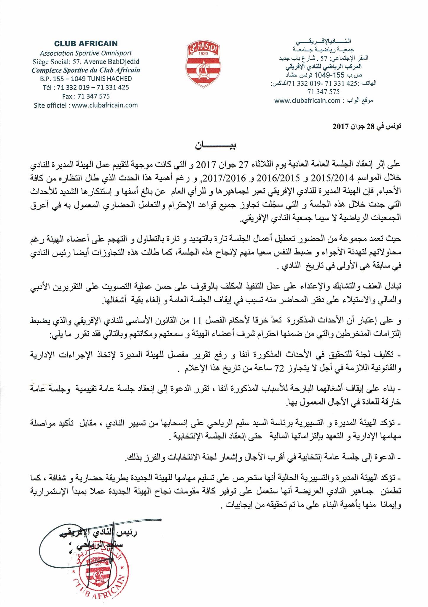 استنكرت الهيئة المديرة للنادي الإفريقي الأحداث التي جدّت خلال الجلسة العامة العاديّة المخصصة لتقييم عمل الهيئة وتجاوز جميع قواعد الاحترام والتعامل الحضاري المعمول به في أعرق الجمعيات الرياضيّة لا سيما جمعية النادي الإفريقي، حسب نصّ البيان.