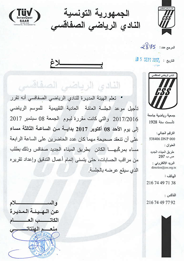 أعلنت الهيئة المديرة للنادي الرياضي الصفاقسي أنه تقرر تأجيل موعد الجلسة العامة العادية التقييمية للموسم الرياضي 2016-2017 والتي كانت مقررة ليوم الجمعة 8 سبتمبر 2017 إلى يوم الأحد 8 أكتوبر 2017 بداية من الساعة الثالثة مساء.
