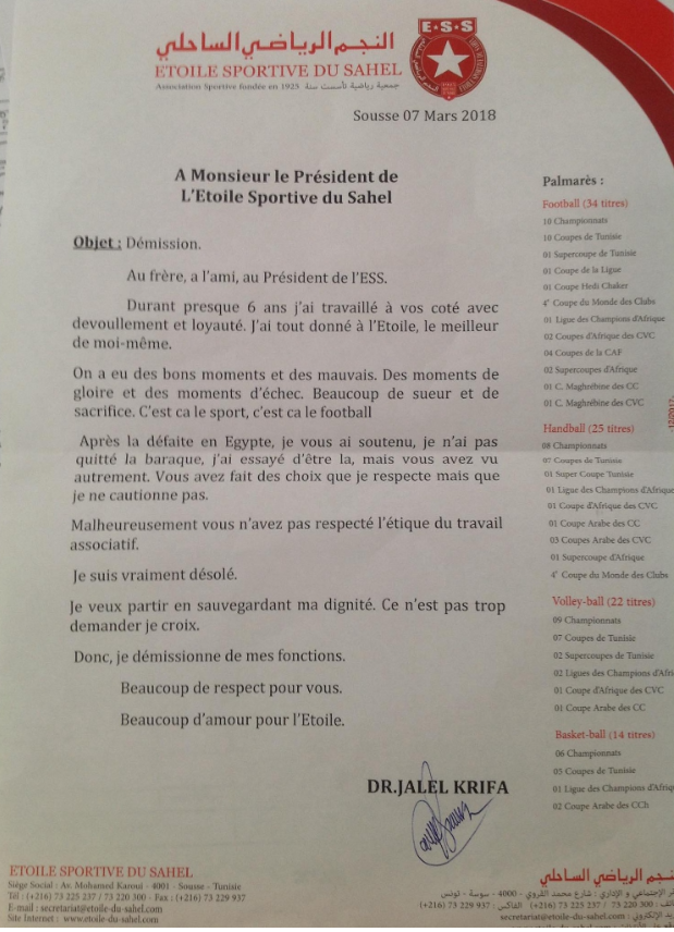 رغم الاتفاق مع رئيس النجم:جلال كريفة يقدم استقالته من جديد‎