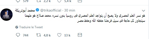 اما النجم المصري الكبير المعتزل محمد ابوتركية فكان شديد التفائل بعودة ولحاق محمد صلاح بالمونيدال وغرد على تويتر قائلا :''هو نسر العلم المصري ولا يصح أن يتواجد العلم المصري في روسيا بدون نسره .محمد صلاح هو ملهمنا سيتجاوز كل حاجة في سبيل فرحتنا حفظه الله وحفظ مصر''