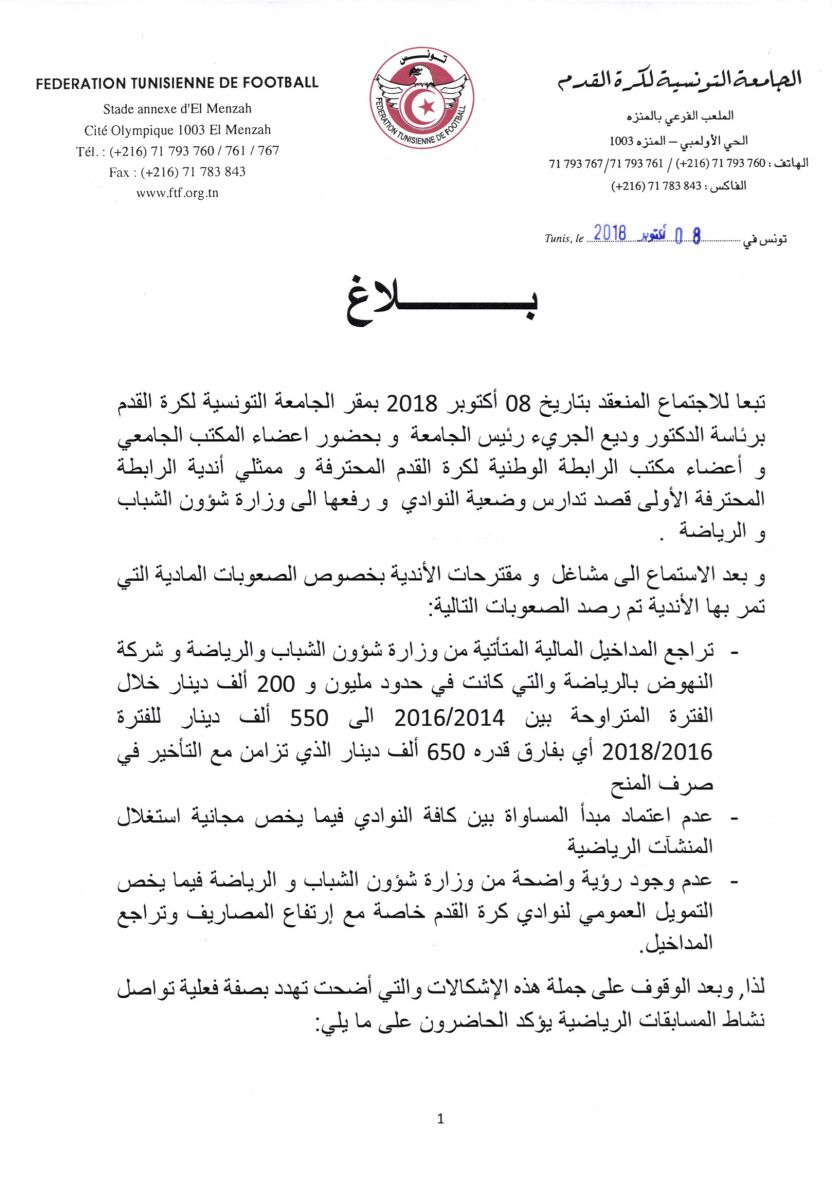 قال  الناطق الرسمي للجامعة حامد المغربي في تصريح لموزاييك اليوم الاثنين 8 أكتوبر 2018، أنّ تقرّر اثر اجتماع المكتب الجامعي بأندية الرابطة المحترفة الأولى، امهال وزارة الرياضة إلى غاية 24 أكتوبر الجاري لايجاد حل بخصوص منح الأندية التي لم يتم صرفها وفي صورة عدم ايجاد حل، فإنّ الأندية ستقوم بايقاف نشاط البطولة نهائيا .