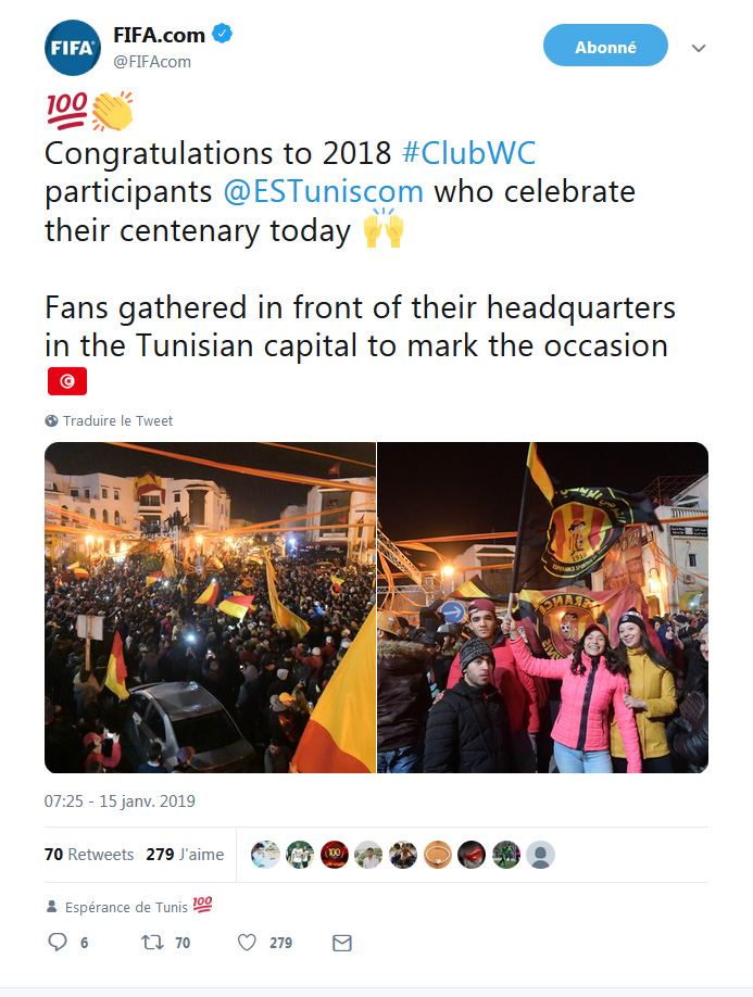 هنأ الاتحاد الدولي لكرة القدم في تدوينة على صفحته الرسمية على الفايسبوك الثلاثاء 15 جانفي 2019 فريق الترجي الرياضي التونسي بمناسبة احتفاله بمرور 100 سنة على تأسيسه.
