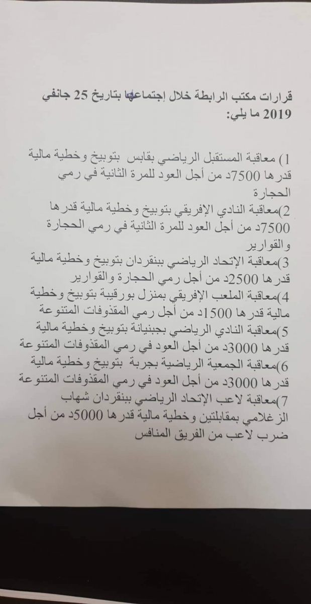 قرر مكتب الرابطة خلال اجتماعه الجمعة 25 جانفي 2019 معاقبة المستقبل الرياضي بقابس وبتوبيخ وخطية مالية قدرها 7500 دينار من أجل العود للمرة الثانية في رمي الحجارة ومعاقبة النادي الإفريقي بتوبيخ وخطية مالية قدرها 7500 دينار .