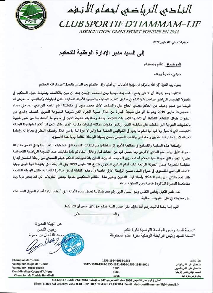 وجهت هيئة نادي حمام الأنف رسالة إلى الإدارة الوطنية للتحكيم عبرت من خلالها عن امتعاضها واستيائها من الأخطاء التحكيمية التي ارتكبت ضد الفريق.