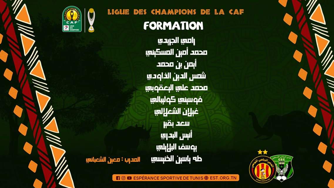 يواجه الرياضي التونسي بعد قليل فريق شباب قسنطينة الجزائري في إطار إياب ربع نهائي رابطة الأبطال الإفريقية وفي ما يلي تشكيلة الترجي الأساسية
