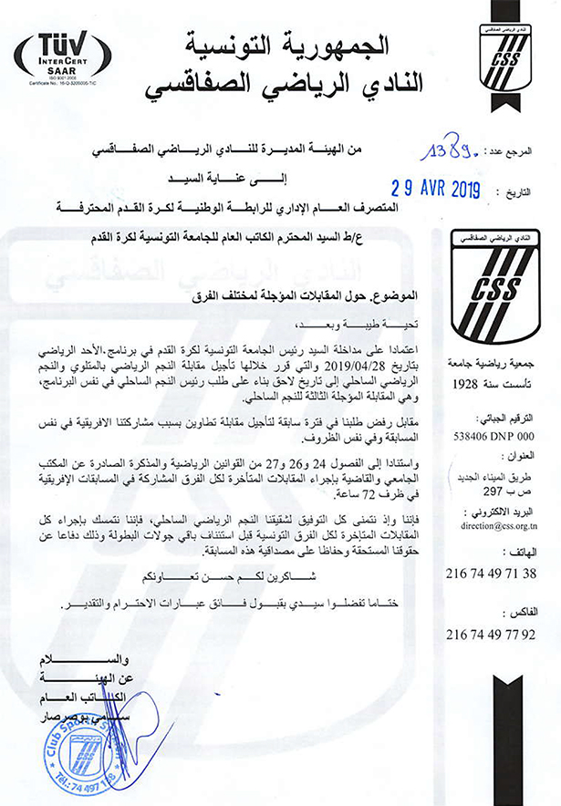 طالب النادي الرياضي الصفاقسي في مراسلة وجّهها إلى الرابطة  الوطنية لكرة القدم المحترفة والجامعة التونسية لكرة القدم، باجراء كل المقابلات المتأخرة لكل الفرق التونسية قبل استئناف باقي جولات البطولة ، وفيما يلي نص المراسلة:
