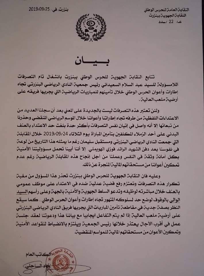 ويذكر أن النقابة الجهوية للحرس الوطني ببنزرت استنكرت في بلاغ ما صدر عن عبد السلام السعيداني تجاه إطارات وأعوان الحرس الوطني خلال تأمينهم للمباريات الرياضية التي يجريها فريقه على أرضية ملعب العالية، معتبرة أنها تصرفات لامسؤولة وليست جديدة'.