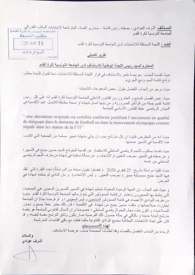 تقدم رئيس منظمة "أنا يقظ" أشرف العوادي، اليوم 26 فيفري 2020، بطعن لدى اللجنة الوطنية للإستئناف التابعة للجامعة التونسية لكرة القدم، ضد اللجنة المستقلة للإنتخابات بالجامعة، على خلفية قبولها لترشح حسين جنيح لعضوية الجامعة ضمن قائمة الرئيس الحالي وديع الجريء.