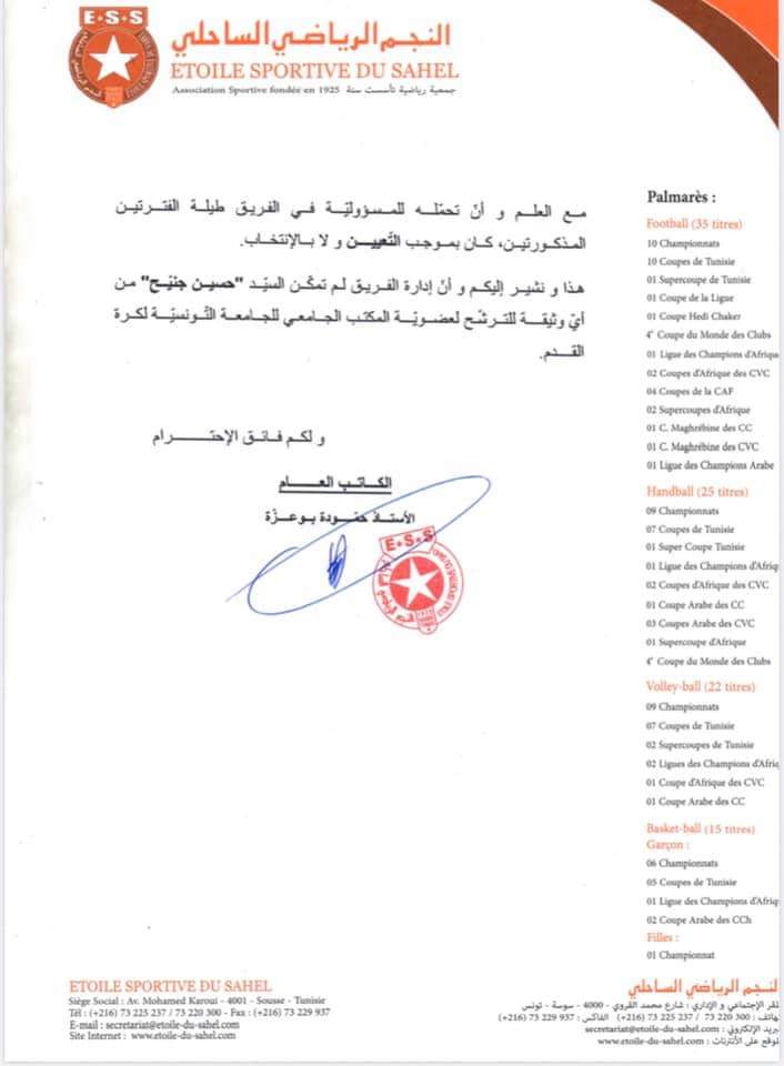 واعتبر العوادي أن ترشح جنيح غير قانوني ومخالف للفصل السابع والعشرين من القانون الداخلي للجامعة التونسية لكرة القدم، ذلك أنه لم يدل بشهادة تسيير مسلمة من إدارة النجم الرياضي الساحلي تثبت أقدميته في التسيير الرياضي صلب النادي.