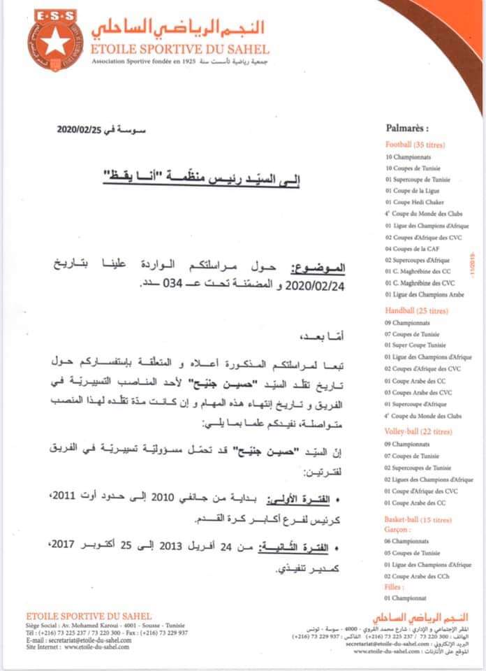 وقد أرفق العوادي ملف الطعن بنسخة من مراسلة تلقاها من إدارة فريق جوهرة الساحل تقر بعدم تسليمها لجنيح أية وثيقة تخول له الترشح لعضوية الجامعة.