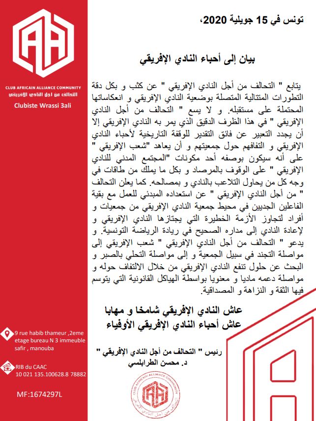 أصدر '' التحالف من أجل النادي الإفريقي'' بيانا إلى أحباء النادي الإفريقي ، أكّد فيه أنّه يتابع عن كثب وبكل دقة التطورات المتتالية المتّصلة بوضعية الفريق وانعكاساتها المحتملة على مستقبله.