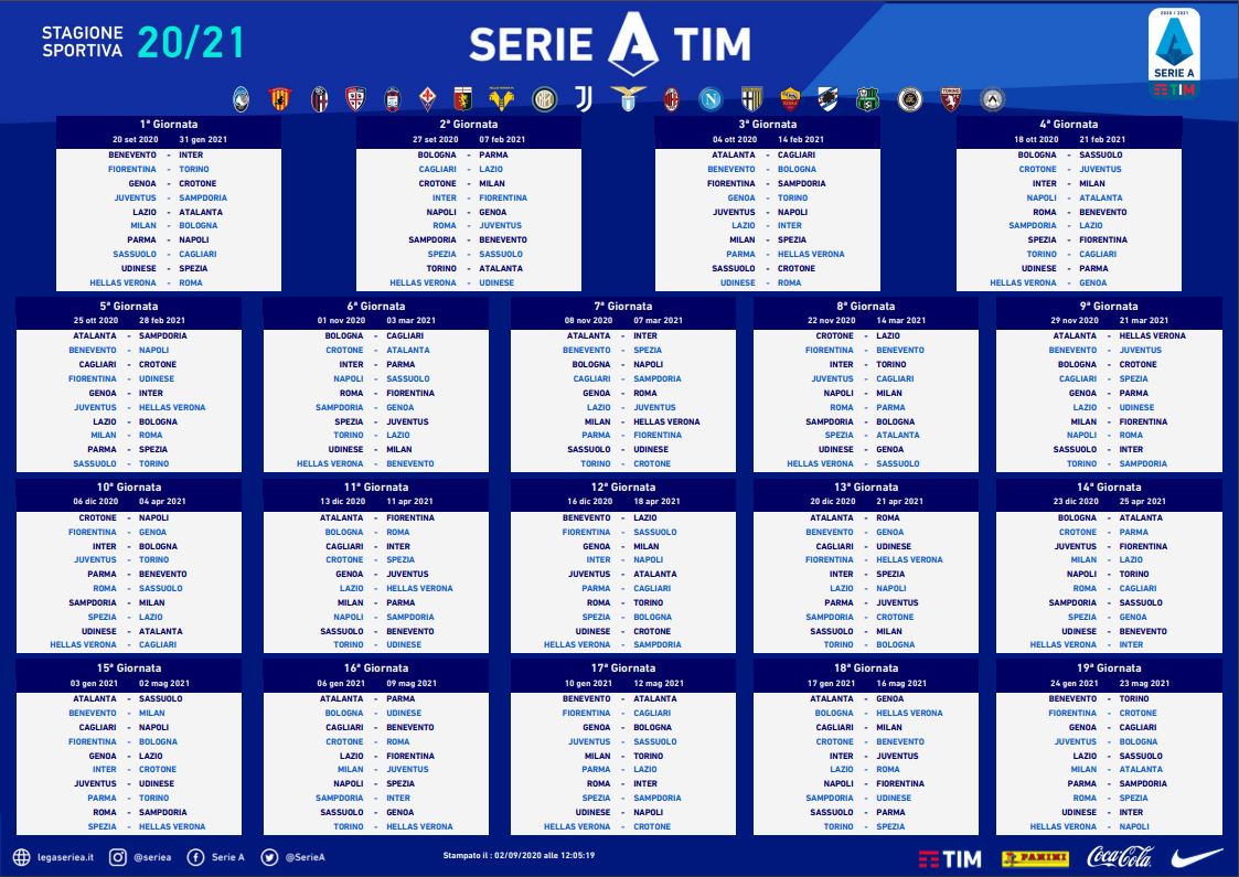 أسفرت نتائح قرعة جدول الدوري الإيطالي التي أقيمت، يوم الأربعاء، عن مواجهات قوية، إذ من المقرر أن ينطلق الموسم الجديد 2020/2021، للبطولة في التاسع عشر من شهر سبتمبر الجاري، حتى الـ 23 من ماي 2021، يتخلله 6 جولات في منتصف الأسبوع ولن يكون هناك راحة في فترة أعياد الميلاد.