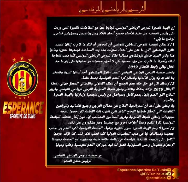 ثانيا: يؤكد الترجي أنّ الملف القانوني والقضائي لنهائي رابطة الأبطال تولته باقتدار اللجنة القانونية للترجي الرياضي التونسي بدعم متواصل من رئيس الجمعية .