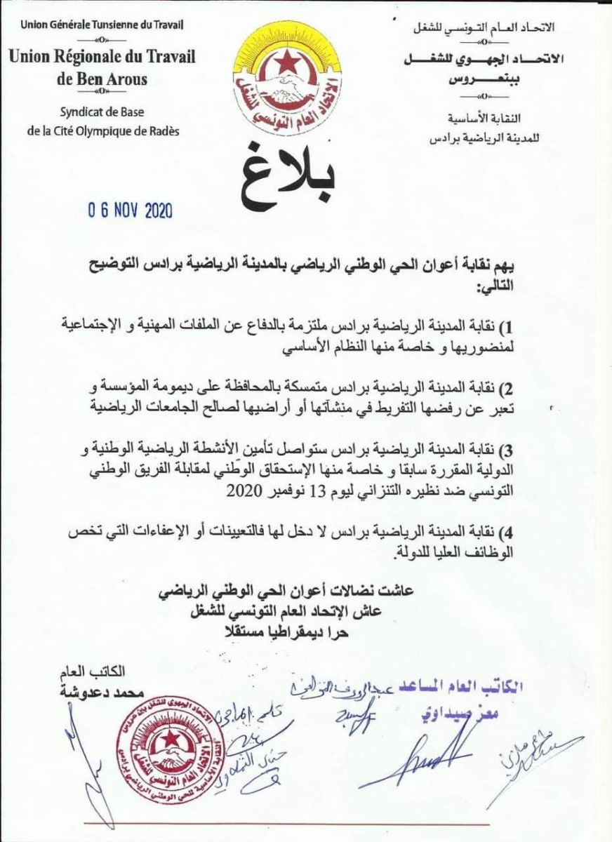 أصدرت نقابة أعوان وإطارات الحي الوطني الرياضي برادس بلاغا أكدت فيه انهم سوف يؤمنون احتضان الحي الوطني لمباراة المنتخب التونسي لكرة القدم مع تنزانيا يومي 13 نوفمبر.