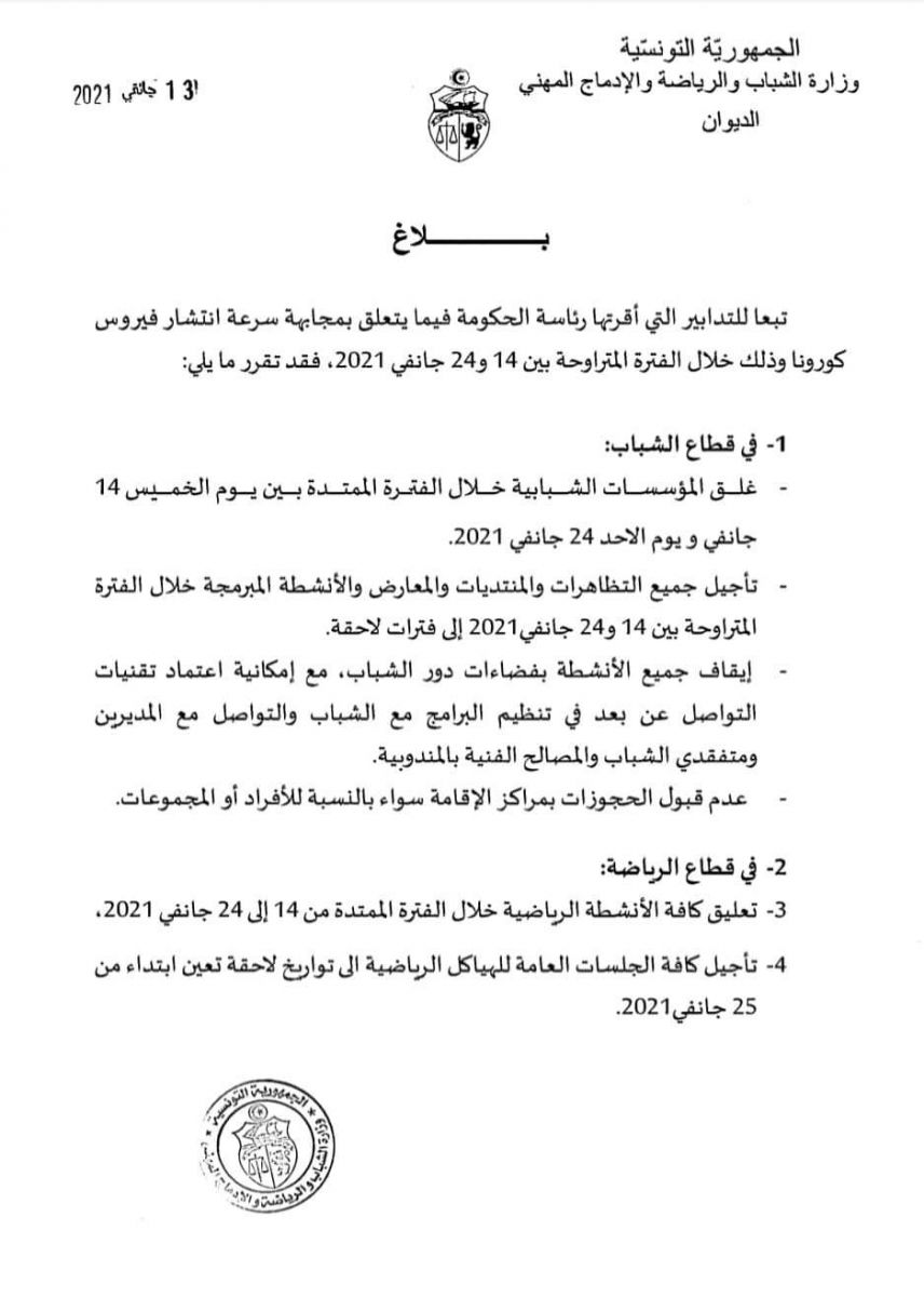 أعلنت وزارة الشباب والرياضة تعليق كافة الانشطة الرياضية في الفترة من 14جانفي إلى 24جانفي 2021.