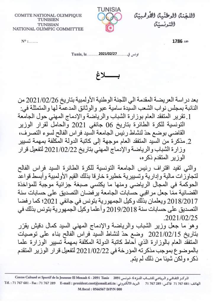 أصدرت اللجنة الوطنية الأولمبية التونسية اليوم السبت 27 فيفري 2021 بلاغا تطالب من خلاله بتأجيل الجلسة العامة الانتخابية لجامعة الكرة الطائرة المبرمجة ليوم غد الأحد 28 فيفري.