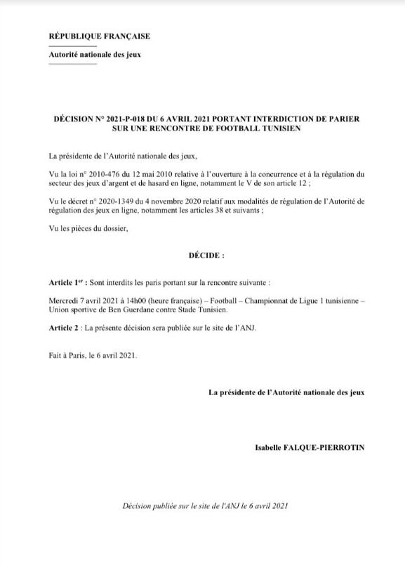 أصدرت الهيئة الفرنسية للألعاب اليوم الثلاثاء 6 أفريل 2021 قراراً يقضي بمنع المراهنات حول المباراة التي تجمع اتحاد بن ڤردان بالملعب التونسي يوم غد الإربعاء ضمن الجولة 23 من الرابطة المحترفة الأولى.