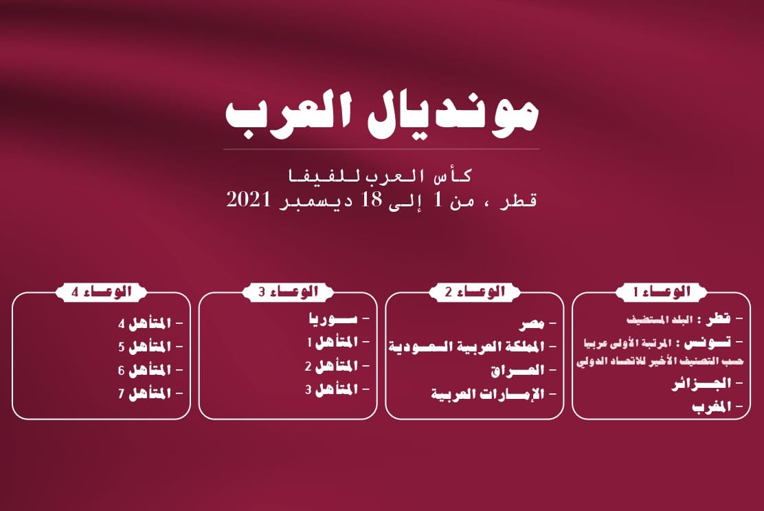 تحتضن غدا الثلاثاء 27 أفريل 2021، العاصمة القطرية الدوحة، بداية من الساعة السابعة مساء بتوقيت تونس، فعاليات قرعة الكأس العربية للفيفا التي ينظمها الاتحاد الدولي لكرة القدم بالتنسيق والتعاون مع الاتحاد القطري واللجنة المنظمة لكأس العالم، من 1 إلى 18 ديسمبر 2021.