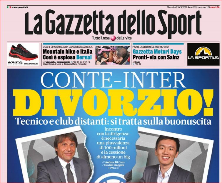 نشرت صحيفة لاغزيتا ديلو سبور الايطالية الواسعة الانتشار في عددها الصادر اليوم الاربعاء 26 ماي 2021 وعلى صدر صفحتها الأولى، خبرا عن طلاق مفاجىء بيين انتر ميلانو والمدرب كونتي .