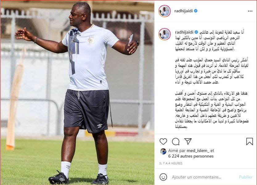 وجّه المدرب راضي الجعايدي رسالة خاصة إلى جماهير الترجي وإلى رئيس النادي حمدي المدب عبر حسابه على انستغرام اليوم الأربعاء 11 أوت 2021،