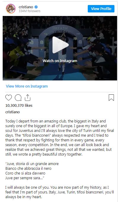 وقال رونالدو في رسالة وداعية نشرها على حسابه في موقع "إنستغرام: "اليوم أغادر فريقا مذهلا، الأكبر في إيطاليا وبالتأكيد واحد من أكبر الأندية في أوروبا".
