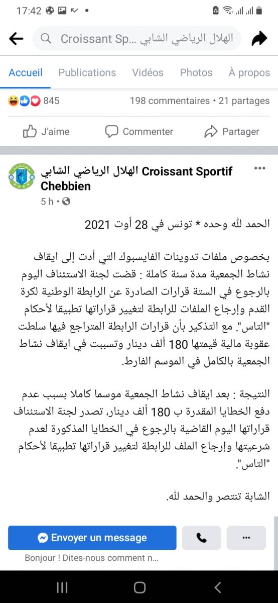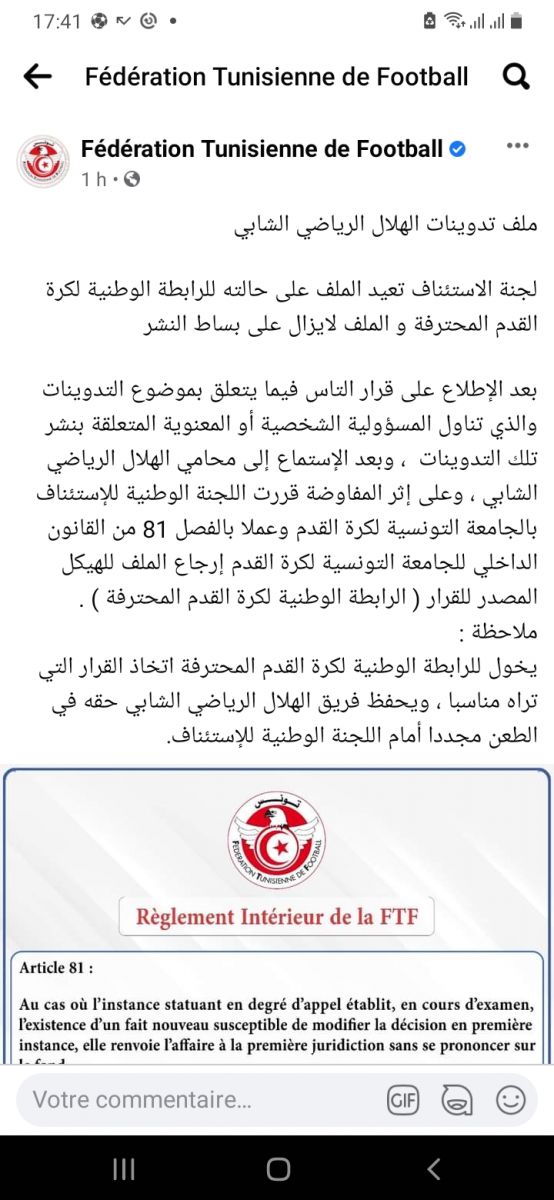 أصدر هلال الشابة اليوم السبت 28 اوت بلاغا اكدت فيه انصياع الجامعة التونسية لكرة القدم لقرارات التاس و التي قضت سابقا بانصاف الهلال في قضية التدوينات غير ان الحامعة سرعان ما اجابت بدورها ببلاغ آخر قالت من خلاله انه تم اعادة الملف الى الرابطة وهي الجهة التي اصدرت العقوبة لتتخذ القرار المناسب مع احتفاظ الشابة بحقها في الطعن.