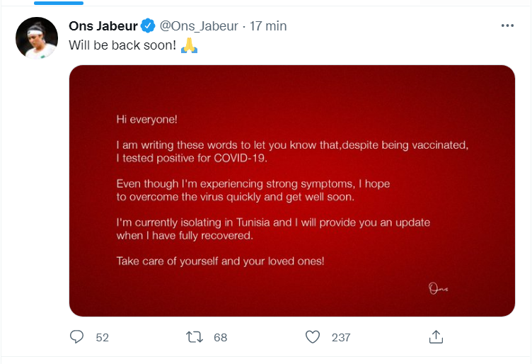 أعلنت بطلة التنس أنس جابر، في تغريدة لها على حسابها الرسمي على تويتر، مساء اليوم الثلاثاء، إصابتها بفيروس كورونا.