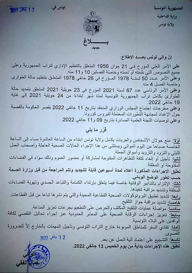 وأشار بلاغ لولاية تونس الأربعاء 12 جانفي 2022 أنّ هذا القرار سيطبّق لمدّة أسبوعين ابتداء من الخميس 13 جانفي، وهو قابل للتمديد وتتم مراجعته من قبل وزارة الصحة حسب تطوّر الوضع الوبائي.