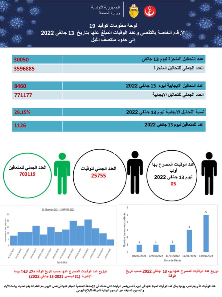 أعلنت وزارة الصحة تسجيل خمس حالات وفاة جراء فيروس كورونا، تم التصريح بها أوليا بتاريخ أمس الخميس 13 جانفي 2022، و8460 تحليلا إيجابيا من مجموع 30050 تحليلا مخبريا، لترتفع بذلك نسبة التحاليل الإيجابية إلى 28.15 %.