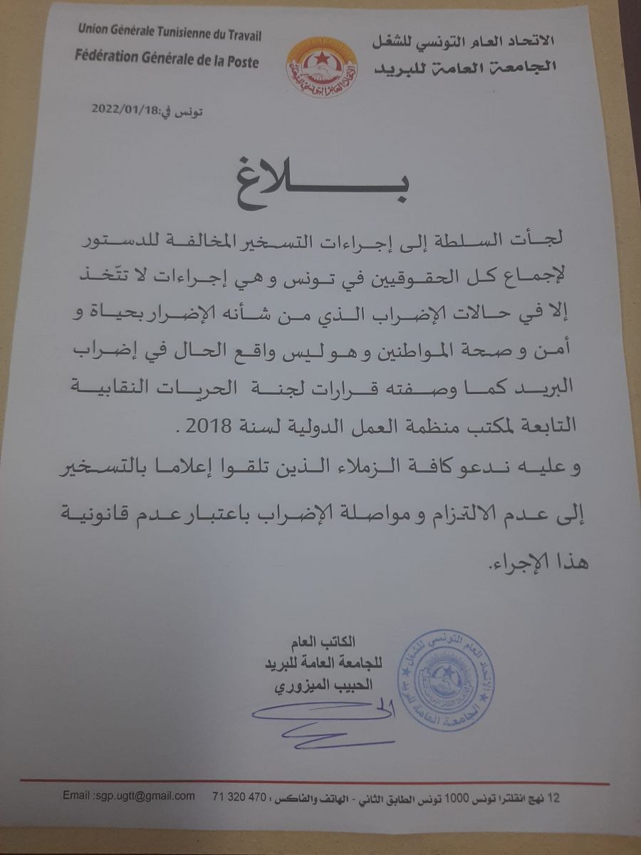 دعت الجامعة العامة للبريد، في بلاغ لها اليوم الثلاثاء 18 جانفي 2021، أعوان البريد الذين تلقوا إعلاما بالتسخير، إلى عدم الالتزام به ومواصلة الإضراب، وأكدت الجامعة أن ''إجراء التسخير غير قانوني''.