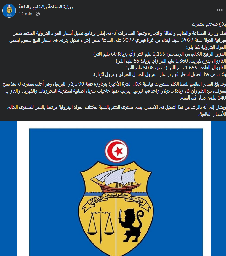 أعلنت وزارتا الصناعة والمناجم والطاقة والتجارة وتنمية الصادرات، في بلاغ مشترك اليوم الإثنين 31 جانفي 2022، أنّه في إطار برنامج تعديل أسعار المواد البترولية المعتمد ضمن ميزانية الدولة لسنة 2022، سيتم ابتداء من غرة فيفري 2022 على الساعة صفر إجراء تعديل جزئي في أسعار البيع للعموم لبعض المواد البترولية كما يلي: