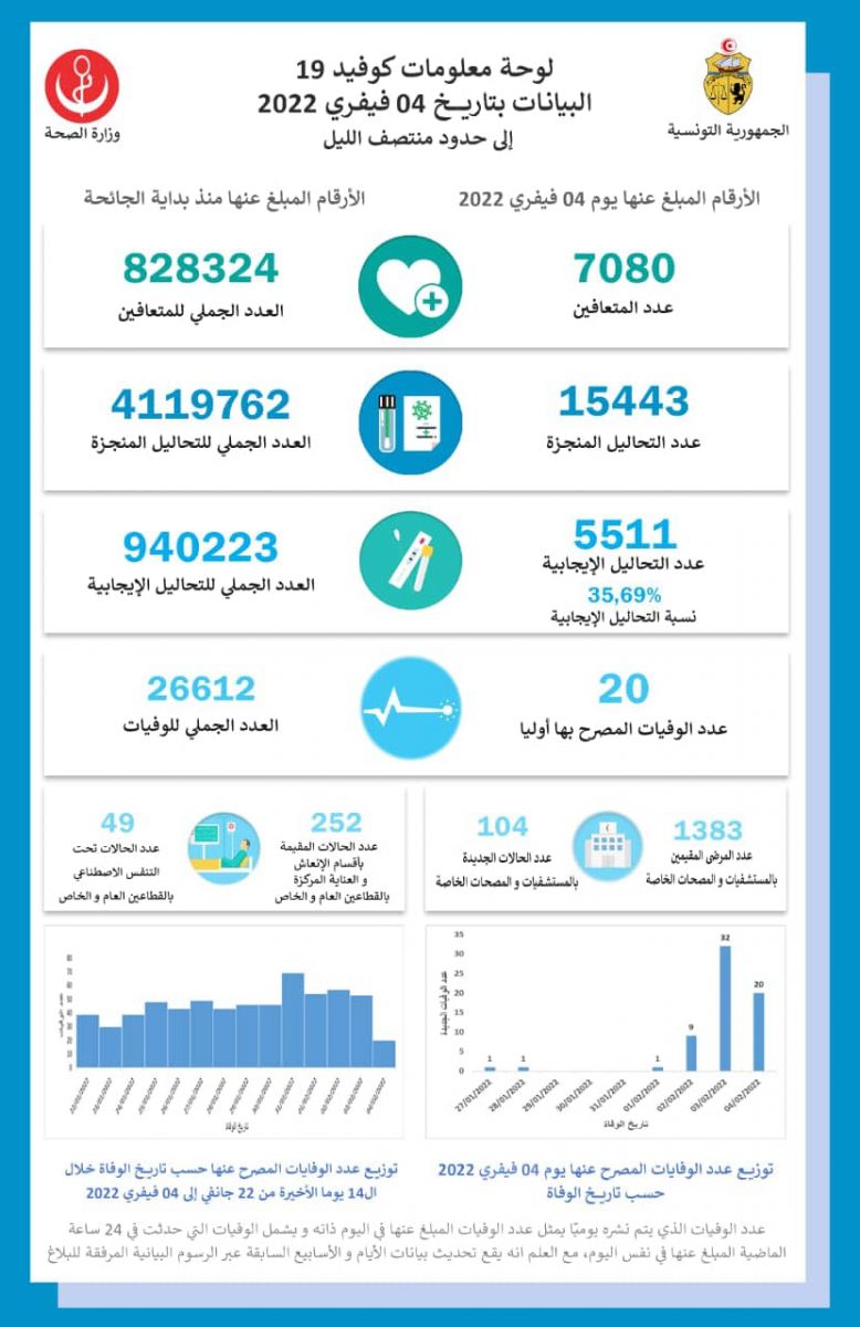 أعلنت وزارة الصحة عن تسجيل  20 حالة وفاة جديدة جراء فيروس كورونا المستجد، تم التصريح بها أوليا بتاريخ أمس الجمعة 4 فيفري 2022، و5511 تحليلا إيجابيا من مجموع 15 ألفا و443 تحليلا مخبريا، لترتفع بذلك نسبة التحاليل الإيجابية اليومية إلى حدود 35.69%.
