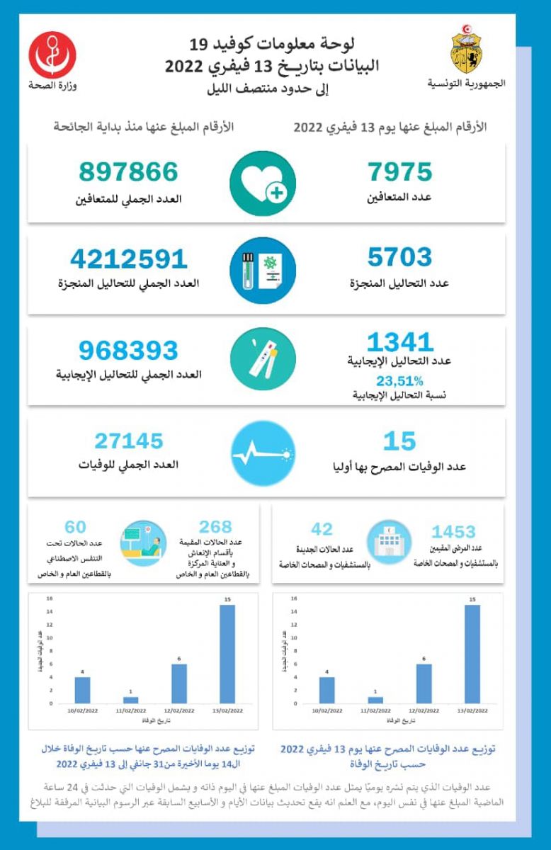 أعلنت وزارة الصحة في آخر التحيينات المتعلقة بالوضع الوبائي أنه تم تسجيل 15 وفاة جراء فيروس كورونا و1341 إصابة جديدة بعد إجراء 5703 تحاليل مخبرية بتاريخ 13 فيفري الحالي.