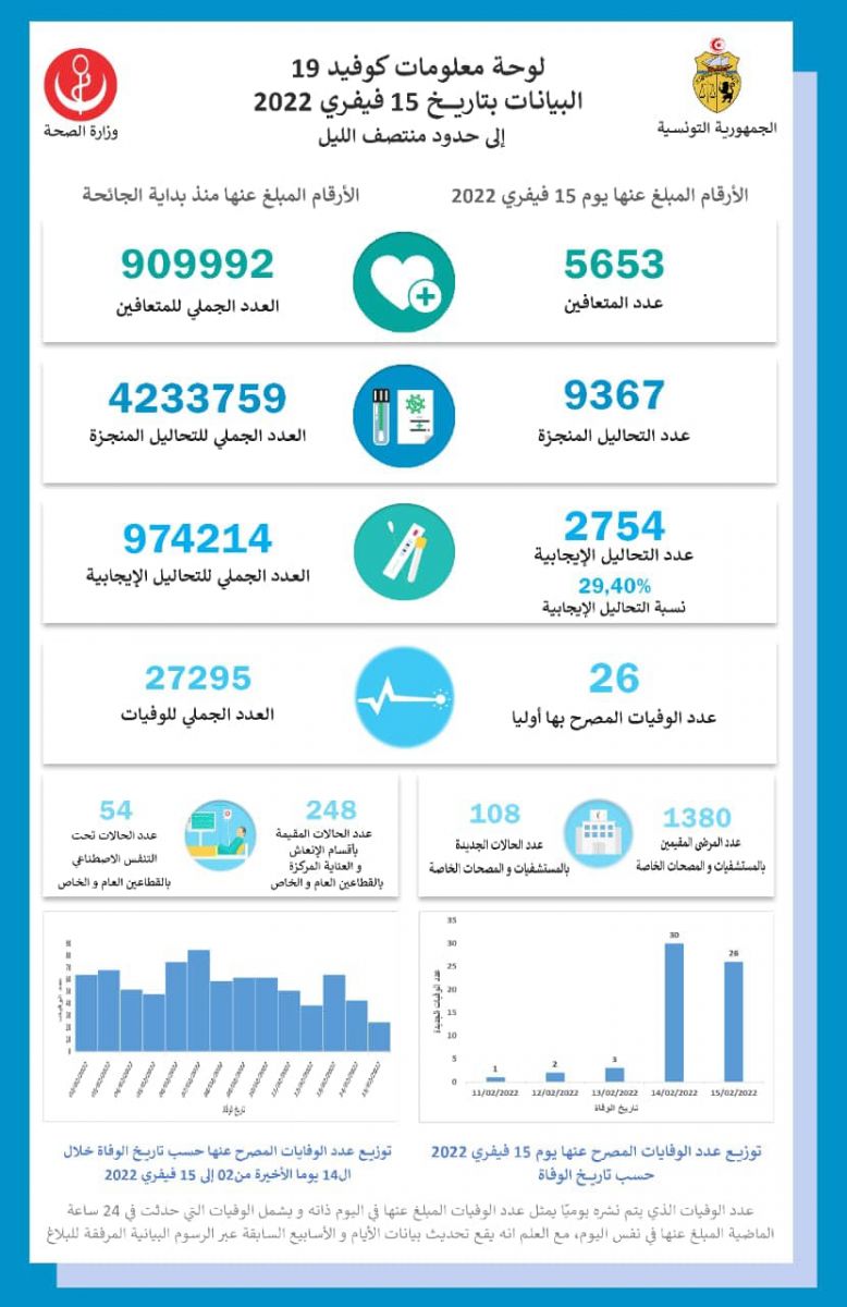 أفادت وزارة الصحة، اليوم الخميس، بأنه تم بتاريخ 15 فيفري 2022، تسجيل 26 وفاة و2754 إصابة جديدة جراء كوفيد-19، ليرتفع بذلك إجمالي عدد الوفايات إلى 27295 وفاة فيما بلغ إجمالي عدد الإصابات 974214 إصابة، منذ ظهور الوباء بالبلاد التونسية خلال شهر مارس 2020.
